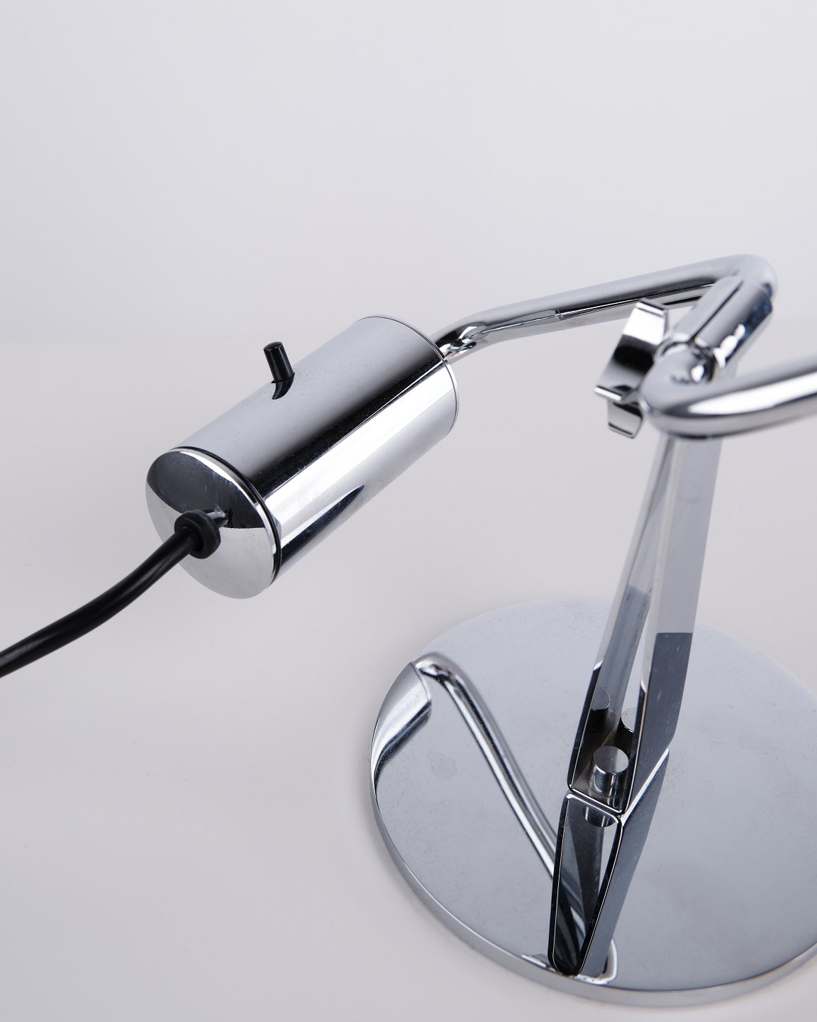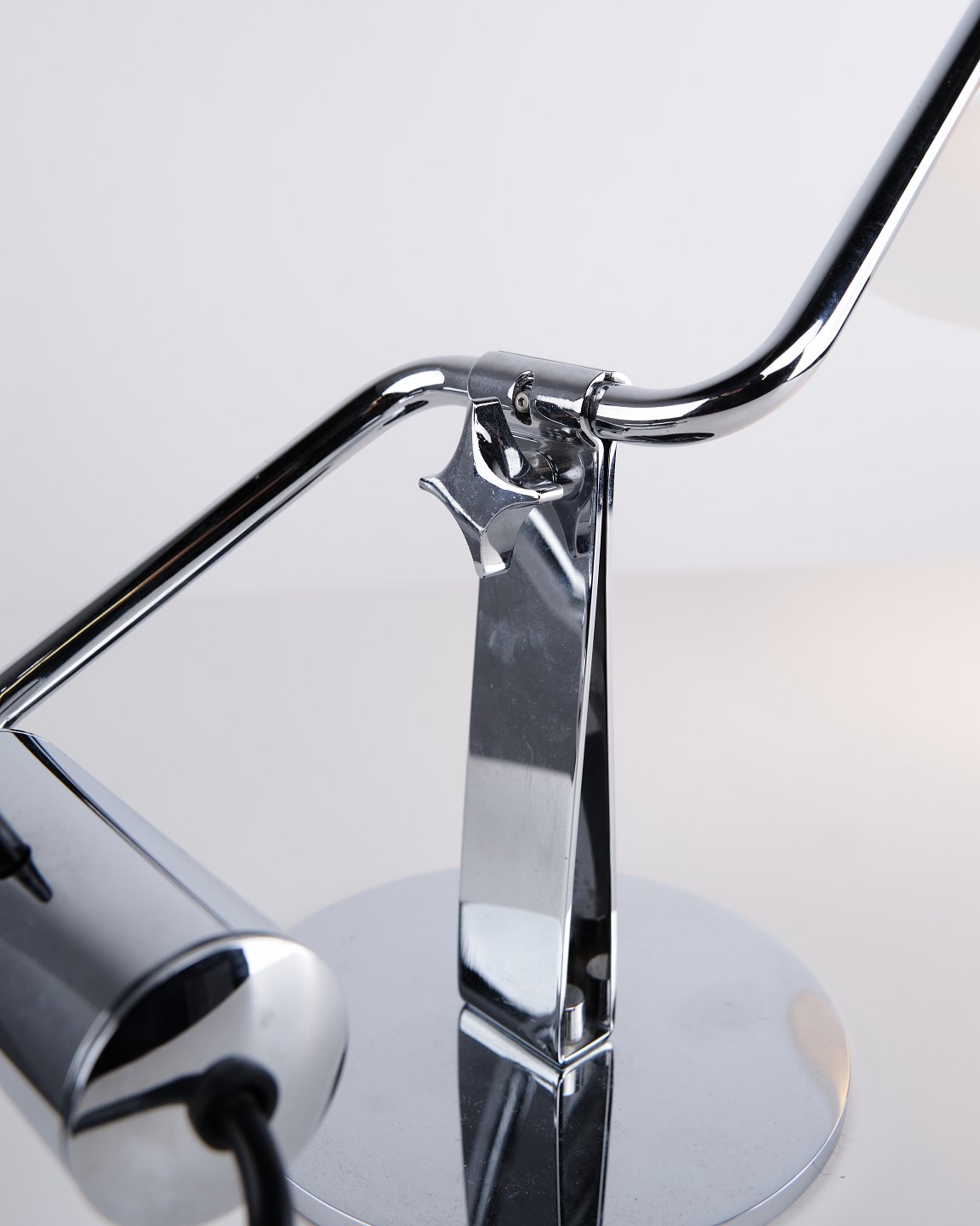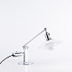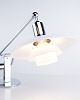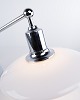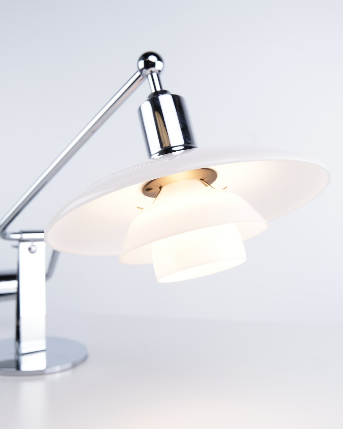 Lampe PH 2/1 piano/orientable conçue par Poul Henningsen et fabriquée par Louis Poulsen. La lampe est réalisée avec des abat-jours en verre opalin blanc et un bras réglable, offrant une direction de lumière flexible et une lumière douce sans éblouissement.