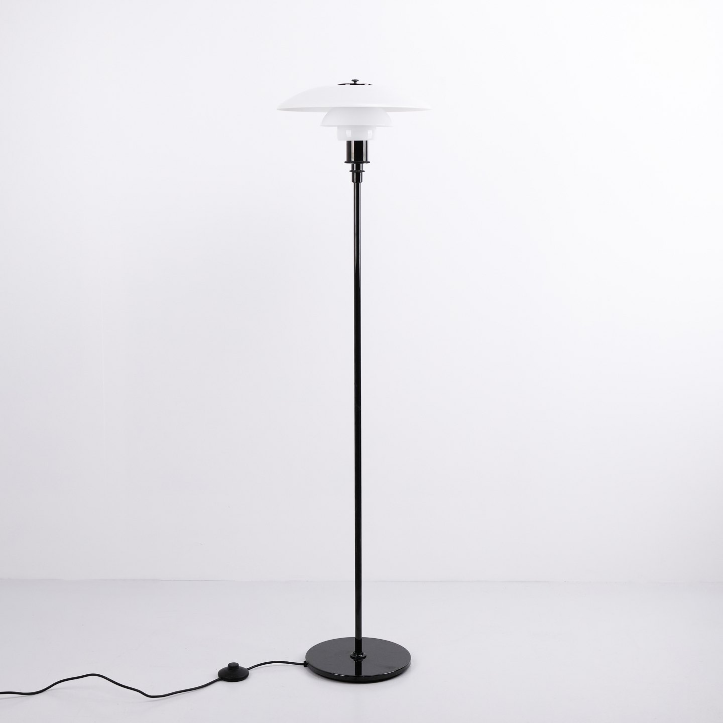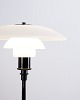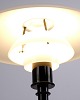Lampadaire PH 3,5/2,5 conçu par Poul Henningsen et fabriqué par Louis Poulsen. La lampe est réalisée avec une structure noire et des abat-jours en verre opalin blanc, offrant une expression élégante et équilibrée. Le système iconique à trois abat-jours assure une lumière douce sans éblouissement et une répartition uniforme de la lumière.