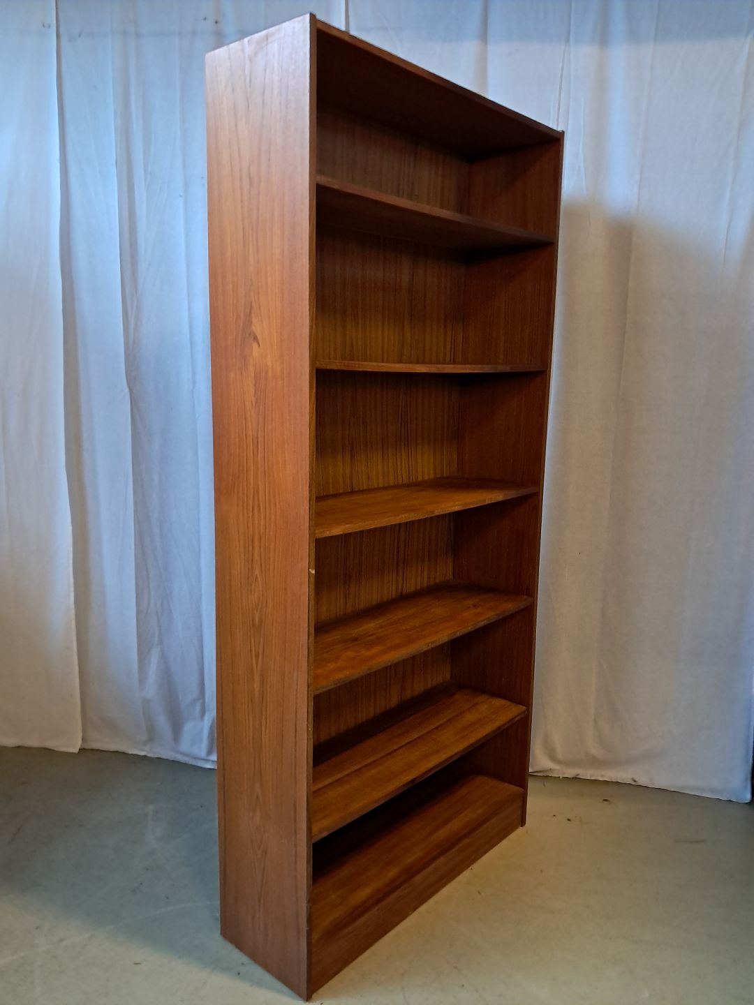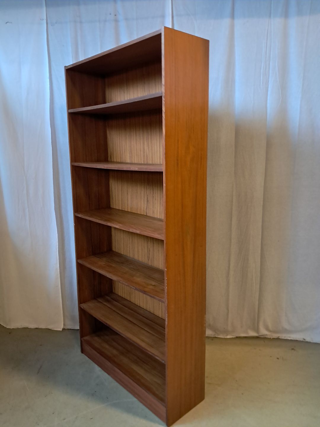 Reol i fineret teaktræ, fra 1960erne. Den har brugsspor. Højde 190cm Bredde 89cm Dybde 29cm Emne nummer: 77293