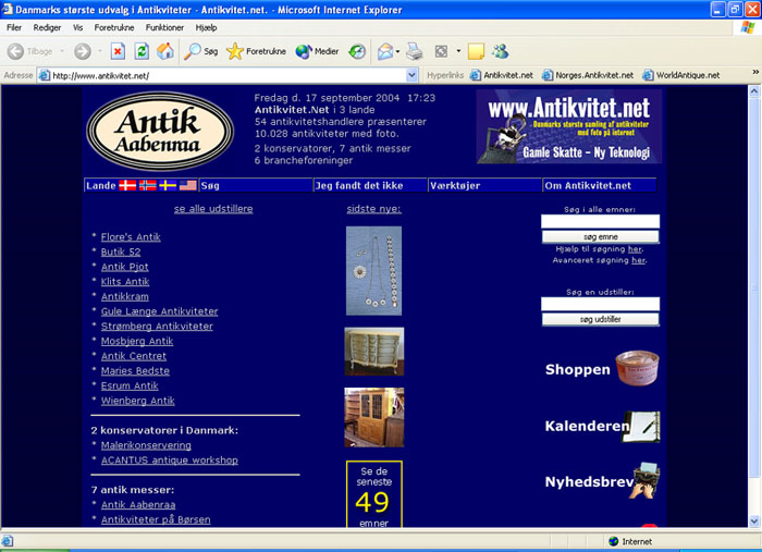 Skærmbillede fra forsiden af antikvitet.net. Udstillerfortegnelse