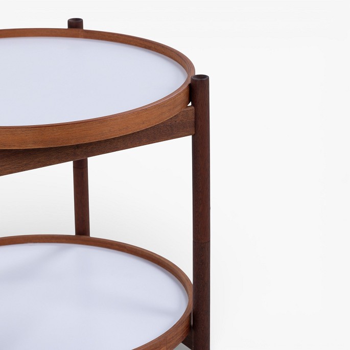 Teak tray table with two reversible trays in black and white formica. Manufacturer's mark.
