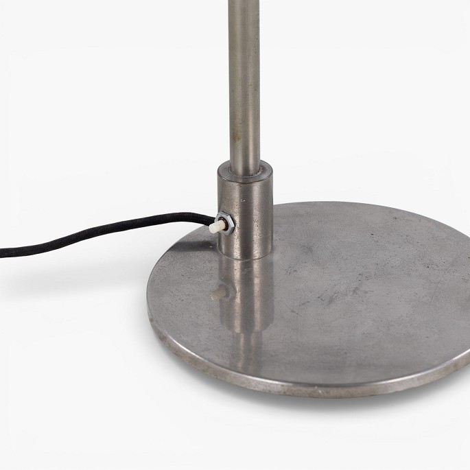 Sjælden bordlampe i forniklet metal med tragtformet skærm. Udført i 1930'erne.