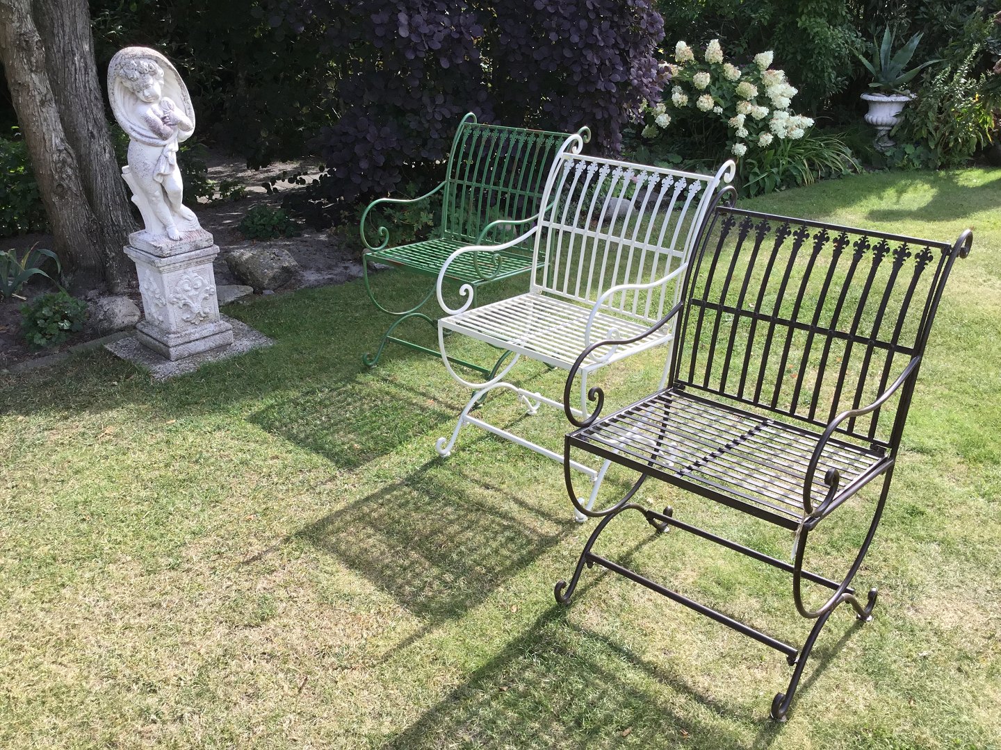 Havestol af smedejern Havestol med armlæn fremstillet af håndsmedet og grønpatineret jern i god kraftig kvalitet Bredde 53 cm Dybde 63 cm Højde 86 cm Sæde højde 44 cm Stolen kan beses i vores butik efter aftale