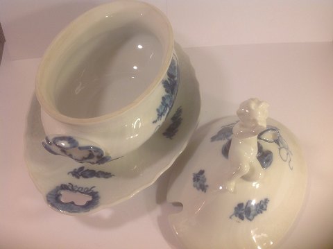 sovseskål med låg ( sovseterrin ) med figur af putti ( dreng med trompet ) på låget.
