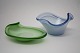 Lysegrønt fad med hvid opaline. Længde 19cm. Bredde 15 cm. Højde 7 cm. Pris: 375 kr. Lyseblå skål med hvid opaline. 18 x 16 cm. Højde 11 cm. Pris: 325 kr.