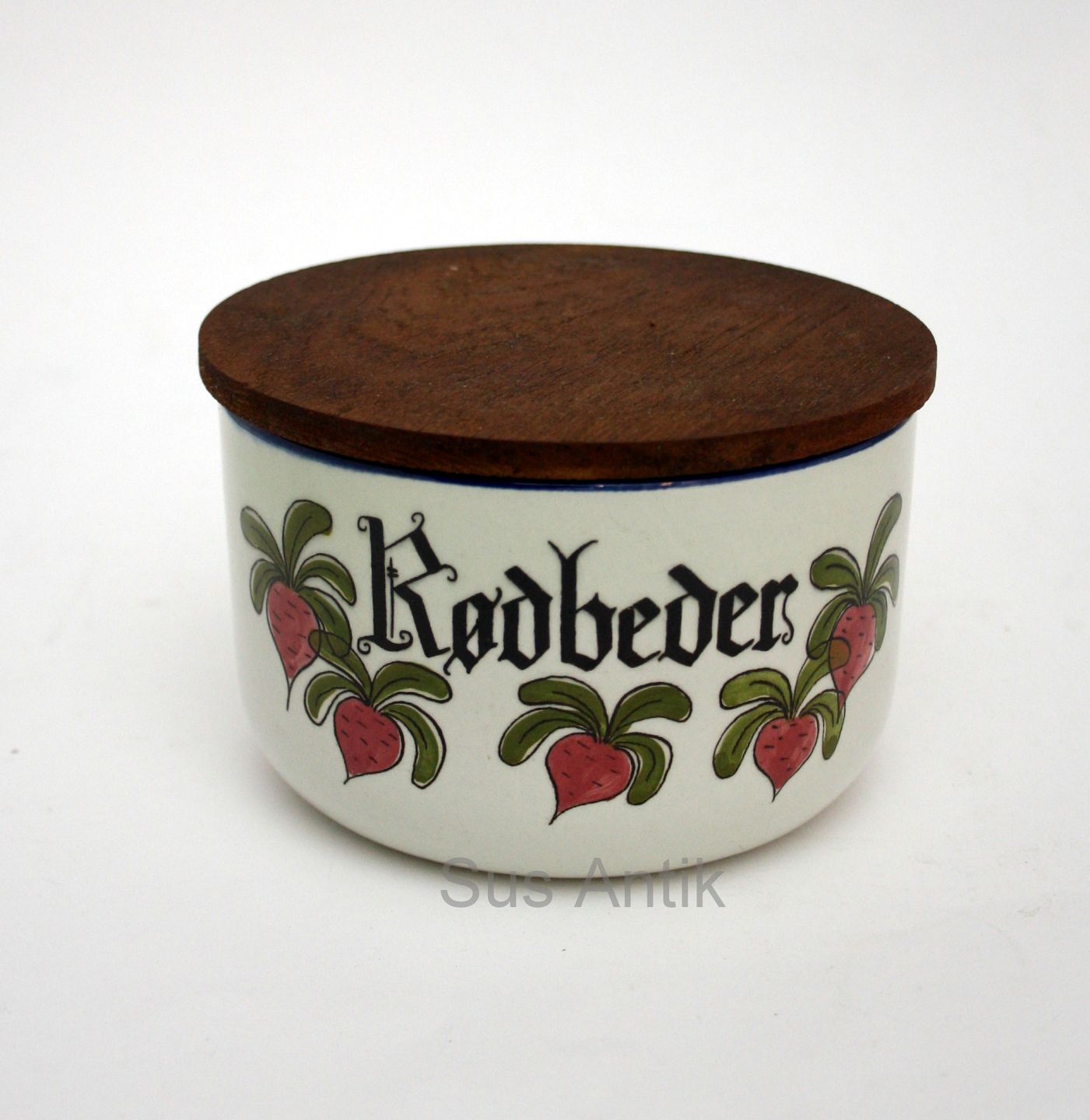 Rødbeder med låg (lav). Låget er lysere end på foto. Højde 8,5 cm. Diameter 13 cm. Få overfladekrakeleringer. Pris: 125 kr. stk. Lager: 1