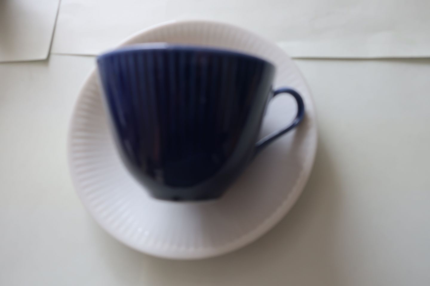 Smukke blå kopper med hvide underkopper Koranska Pinstripe serie 4 x kopper 7 x underkopper H: 6,5cm kop Diam: 13cm underkop Prisen er for alle viste kopper/underkopper Flot stand Varenr.: KM1005